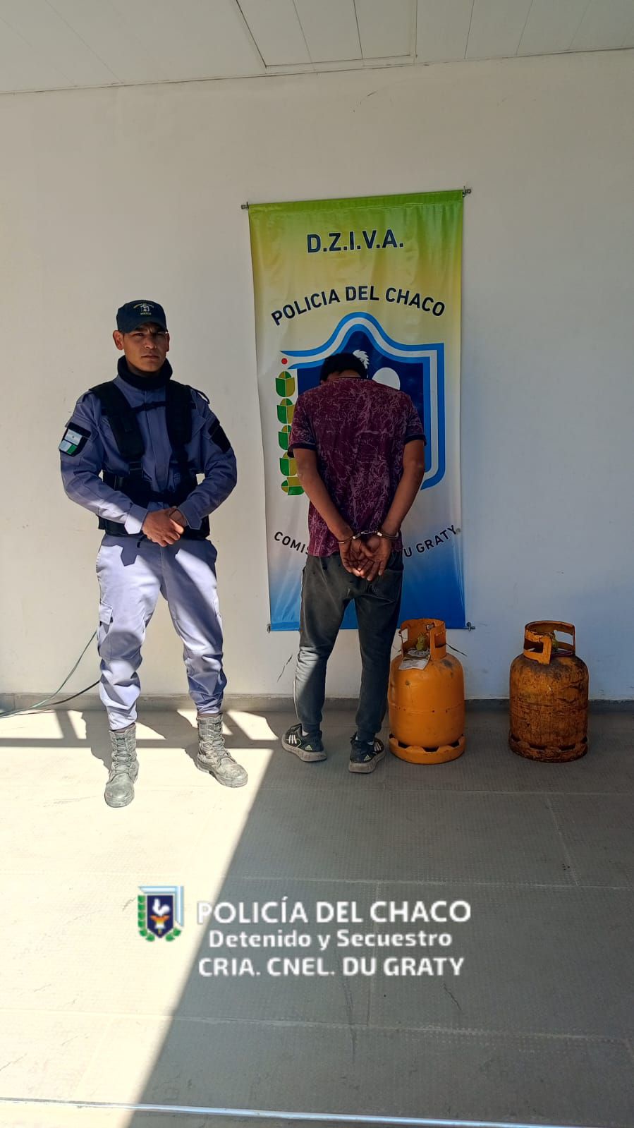 Un hombre de 53 años denunció el domingo que, entre las 19 y las 23 horas se ausentó de su domicilio donde posee un kiosco y al regresar notó que alguien ingresó forzando la puerta de madera de dicho lugar, constatando la faltante de dos tubos de gas de carga completa. El personal policial de la localidad comienza con las averiguaciones logrando tomar conocimiento ayer lunes de que el supuesto autor habría escondido uno de los tubos de gas entre las malezas en un baldío, los agentes luego de rastrillar el lugar indicado, logran encontrar el cilindro procediéndose al secuestro del mismo. Continuando con las tareas investigativas el personal se dirige hasta la morada del supuesto autor un masculino de 23 años y al intentar conducirlo desde la vereda, tres femeninas intentan evitar su aprehensión, haciendo uso de la fuerza en la medida de lo necesario logrando conducir a esta persona previo a ser examinado por el médico policial. Luego familiares del autor del delito hacen entrega del segundo tubo de gas que se encontraba dentro del domicilio.
