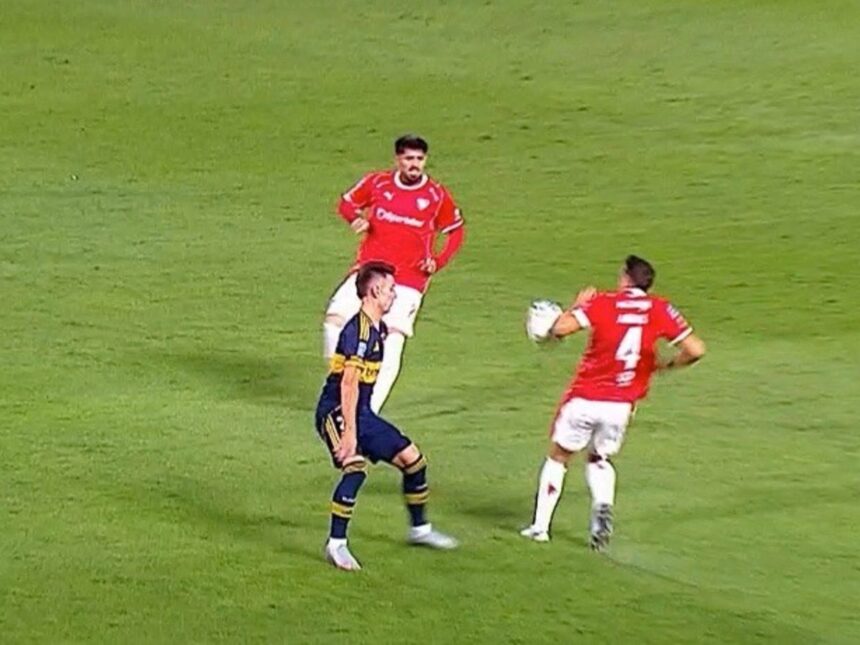 Al momento del centro que derivó en el gol se ve claramente que todos los atacantes del Rojo están habilitados. No obstante, cuando Boca perdió la pelota, la pelota le dio en el codo a Santiago Arias, lateral del CAI. Esto último fue lo que se reclamó en el lado azul y oro. Luego de la revisión VAR, sin convocar a Merlos (Diego Novelli estuvo a cargo) se vio que la jugada no forma parte del APP, por lo que el gol fue válido.