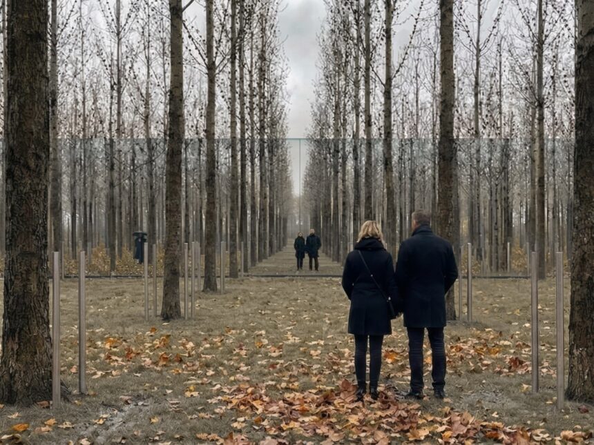 El corazón del proyecto es el bosque que se despliega entre las dos barras. En ese espacio intermedio se organiza una grilla regular de fresnos rojos, plantados cada cuatro metros.